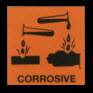 | B) The second label is the corrosive label. This label is signified by two containers with droplets from each one onto a hand and one onto metal block. The use of safety equipment is essential such as gloves face mask and goggles. |